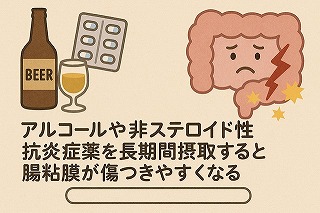 アルコールや非ステロイド性抗炎症薬(NSAIDs)を長期間摂取すると、腸粘膜が傷つきやすくなります。